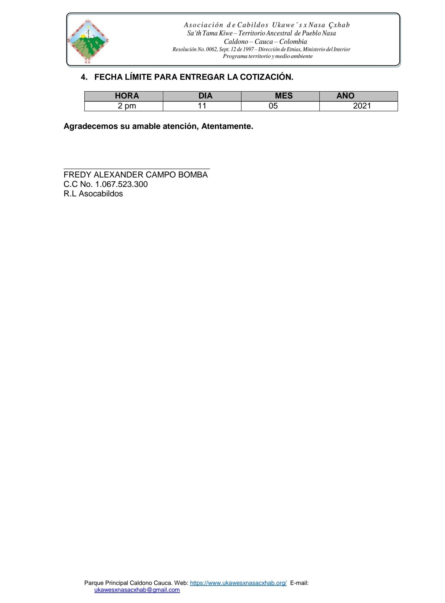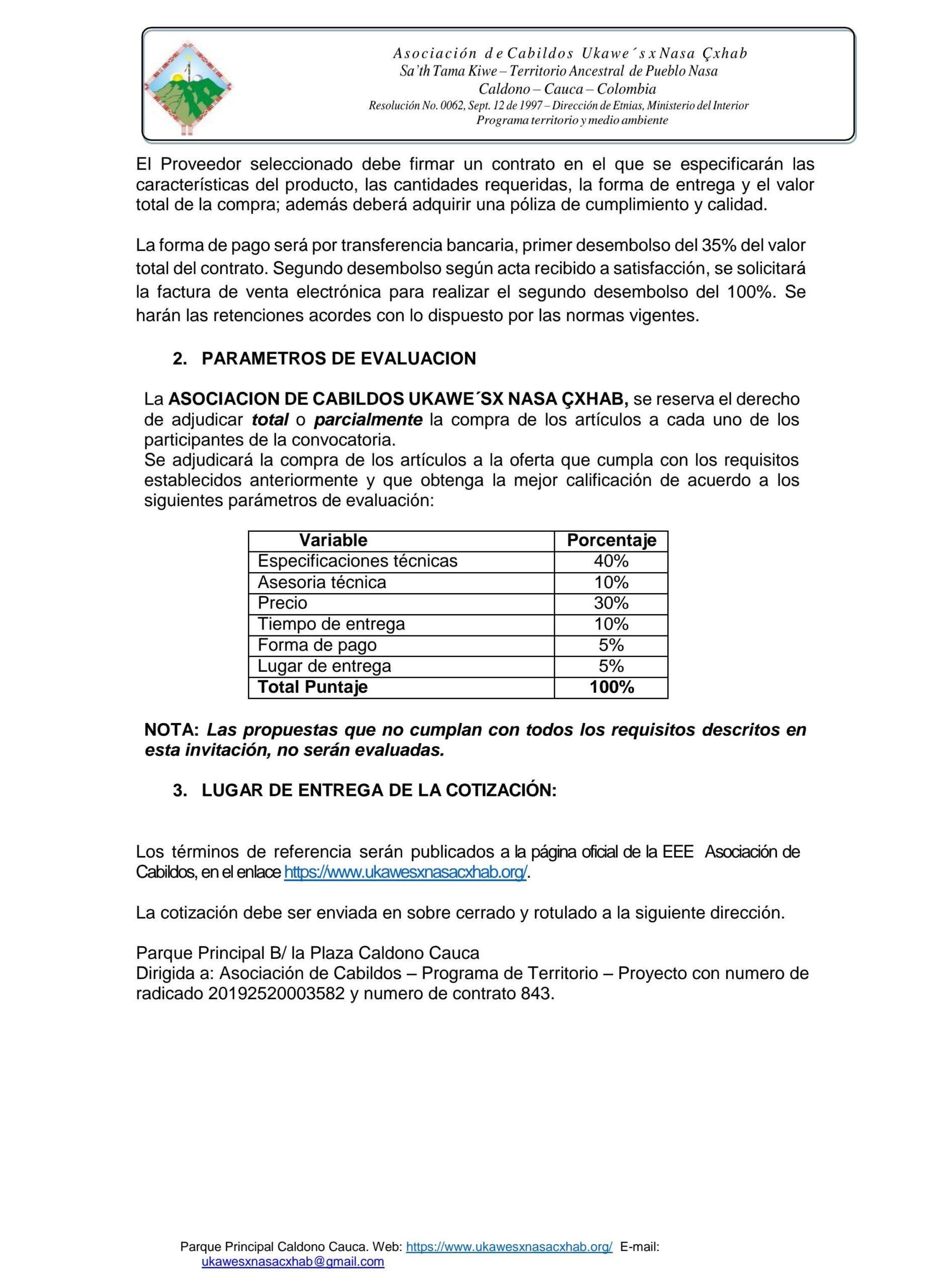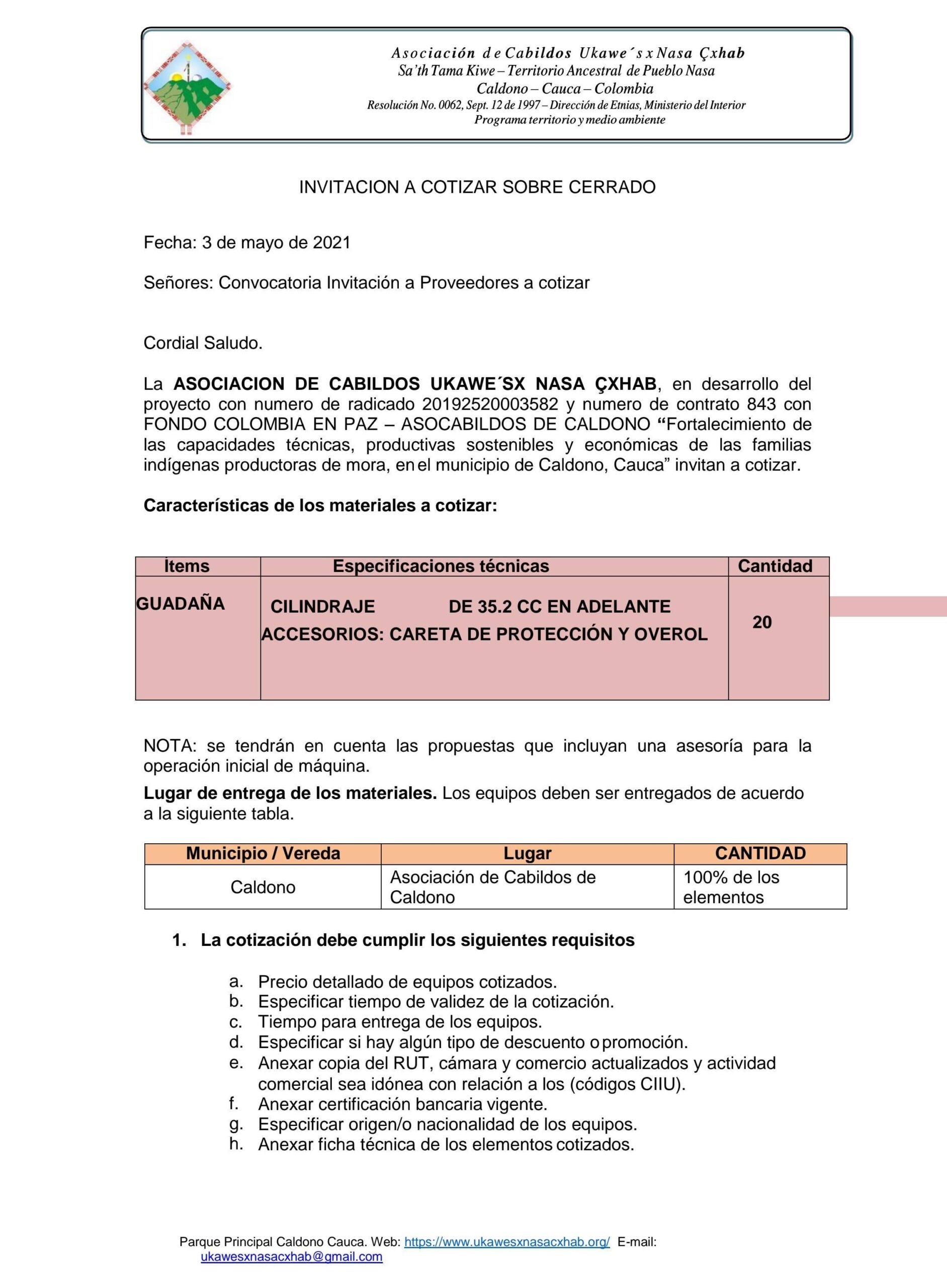 1.INVITACION A COTIZAR GUADAÑASDescarga 1. Invitación a cotizar guadañas.Descarga 1. Invitación a cotizar guadañas.Descarga 1. Invitación a cotizar guadañas.Descarga Navegación de entradas Controlemos la diabetes, es importante! Si no, tendremos consecuencias para toda la vida La asociación de Cabildos Ukawe’sx Nasa Çxhab, en desarrollo del proyecto con número de radicado 20192520003582 y número de contrato 843 con FONDO COLOMBIA EN PAZ – ASOCABILDOS DE CALDONO «Fortalecimiento de las capacidades técnicas, productivas sostenibles y económicas de las familias Indígenas productoras de mora en el municipio de Caldono, Cauca» invitan a cotizar: